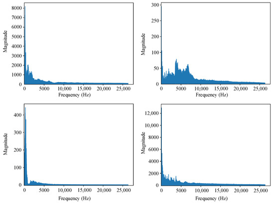 Ship-radiated noise primarily results from the superposition of continuous and line spectra, with mechanical and propeller noise being its main sources. This study uses the Deepship [33] dataset to ensure the reliability of the research findings. The dataset, which contains real ship noise data, is also used to verify the practicality and robustness of the network. The dataset contains 47 h and 4 min of actual underwater recordings, with data collected over nearly 29 months at measurement sites throughout the year. Figure 1 presents the spectral analysis results obtained from random sampling of the Deepship dataset in the frequency domain. The analysis clearly shows that the noise spectrum within the Deepship dataset exhibits typical characteristics of marine environmental noise, encompassing frequency components originating from diverse noise sources.