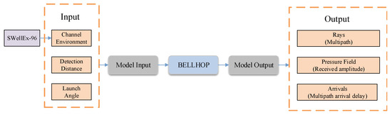 The BELLHOP ray acoustic model is used to simulate the Underwater Acoustic (UWA) channel environment [34]. In this study, we apply the BELLHOP model in combination with the measured marine environmental dataset SWellEx-96 to emulate the underwater acoustic channel more realistically. This approach enables the simulation of ocean noise and channel interference under real-world conditions. A schematic illustration of the BELLHOP model appears in Figure 2.
