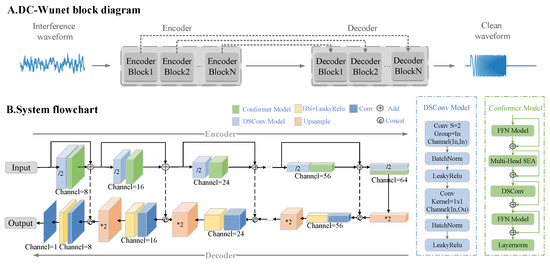 (A) A block diagram of the DC-WUnet system. The encoder is used to recognize the target signal in the noise signal and extract its feature information, and the decoder reconstructs the target signal based on the extracted signal features. (B) A flowchart of the proposed system. Each encoding block consists of a Conformer module and a depth-separable convolution, and the decoding block consists of a down-adoption module and a convolution module.