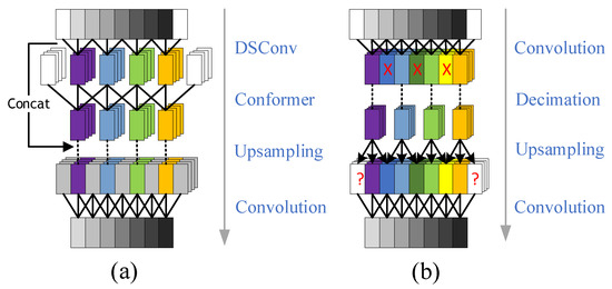 Convolution and discard operations are typically used for upsampling and downsampling along the time dimension, as shown in Figure 4b. During upsampling, convolution with zero padding extends the time dimension but also introduces high-frequency noise. From the frequency domain perspective, the multipath and Doppler effects cause distortion of the signal’s frequency components. The use of zero padding further inserts artificial zero values into these distorted frequency components, resulting in spectral discontinuities. These discontinuities produce spurious frequency components, which hinder the network’s ability to accurately reconstruct the signal’s frequency information.