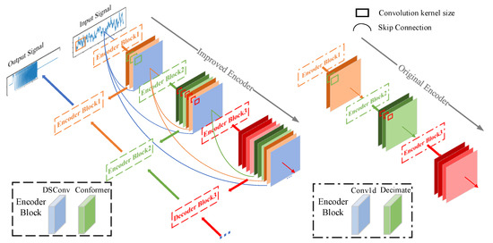The proposed network parameters are given in Table 1, where e and d represent the coding and decoding layers, respectively, and are the input and output dimensions of the corresponding coding and decoding layers, is the time-domain signal length, is the number of coding and decoding layers, and is the initial number of input passes.