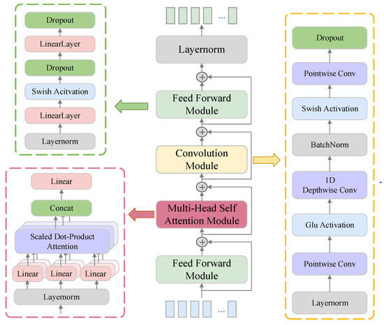 - Gulati, A.; Qin, J.; Chiu, C.-C.; Parmar, N.; Zhang, Y.; Yu, J.; Han, W.; Wang, S.; Zhang, Z.; Wu, Y.; et al. Conformer: Convolution-augmented transformer for speech recognition. arXiv 2020, arXiv:2005.08100. [Google Scholar]