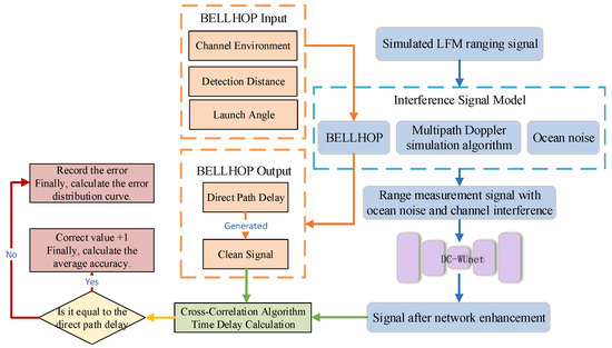 To evaluate the performance of the constructed model, 15,000 hydroacoustic signals with measured ship-radiated noise (as described above) and channel interference were simulated under different SNR environments using the signal model described in Section 3.2. From these signals, 13,000 were randomly selected for training, 1000 for validation, and the remaining 1000 for testing. Each signal was sampled at 48 kHz. The simulation parameters are provided in Table 2. Additionally, the direct path delay values were obtained using BELLHOP, which served as the ground truth for delay estimation accuracy in the subsequent network enhancement evaluation.