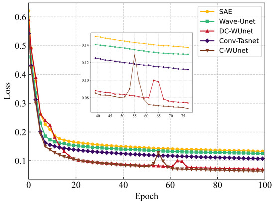 Figure 8 presents the network training loss for five methods with ship-radiated noise, multipath, and Doppler interference at SNR = −10 dB. The results show that the loss increases slightly after 50 epochs due to the introduction of frequency domain loss, which suppresses the amplitude of the compressed signal in the time domain. In the early stages of training, time-domain loss dominates, while in the later stages, frequency-domain loss becomes dominant.