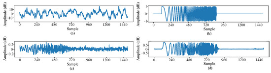Signals before and after joint time–frequency domain training using DC-WUnet. (a) is a clean signal, (b) is an interference signal, (c) is the enhancement effect of the network trained in the time domain, and (d) is the enhancement effect of the network trained jointly in the time-frequency domain.