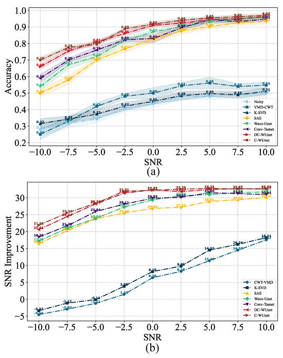 The shaded region in Figure 10 represents the error range after three-fold cross-validation. The results show that DC-WUnet and C-WUnet have smaller error ranges, indicating stronger robustness. Both models incorporate the Conformer module, which uses multi-head attention to extract key information from different feature spaces, thus enhancing model robustness. Additionally, both DC-WUnet and C-WUnet employ joint time–frequency domain training, which imposes stricter constraints on signal reconstruction, further improving their robustness.