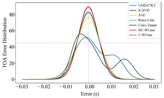 Figure 11 presents the TOA estimation error distributions. The results show that the error distribution curves of both C-WUnet and DC-WUnet are higher and narrower compared to those of other algorithms. This indicates that their estimation errors are more tightly concentrated around zero, reflecting smaller average errors. In the context of underwater localization, such reduced delay estimation errors translate directly into lower positioning errors. These findings suggest that C-WUnet and DC-WUnet are better suited for reliable signal processing in underwater localization tasks. The traditional time–frequency domain algorithms KSVD and VMD-CWT can improve noise reduction and increase the SNR to some extent. However, in low SNR conditions, they lack the ability to effectively capture and reconstruct the signal, resulting in substantial residual noise and low TOA accuracy. In high SNR conditions, noise is no longer the primary factor affecting TOA accuracy. Instead, signal superposition and frequency shifts caused by multipath and Doppler effects severely impact TOA estimation accuracy, leading to large positioning errors. Therefore, these algorithms are not suitable for use in underwater acoustic signal positioning systems.