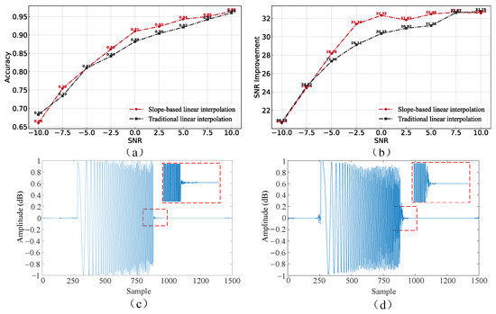 According to Figure 12a,b, it can be seen that the slope-weighted interpolation method improves the correct TOA rate and signal-to-noise ratio over the traditional interpolation method under high SNR conditions, whereas it is not much different from the traditional interpolation method under low SNR conditions. This is because at high SNR, the noise component in the signal is smaller, and the slope more accurately reflects the trend of the data. The interpolation method based on slope weighting can make better use of the neighborhood data information before and after the target signal, which can make the interpolation point closer to the real signal, inhibit the high-frequency noise introduced before and after the target signal, and enhance the effect better than linear interpolation. As shown in Figure 12c,d., under the condition of a low signal-to-noise ratio, the noise component in the signal is significant, the slope calculation may be affected by noise, and the enhancement effect is similar to linear interpolation.