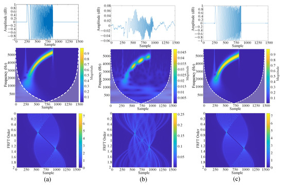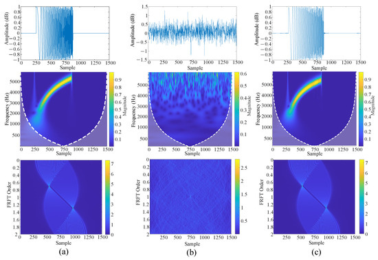 Figure 13b and Figure 14b present the interfering signal at SNR = 2.5 dB and −2.5 db in the time domain, frequency domain, and 2D Fractional Fourier Transform (FRFT), respectively. The corresponding results after DC-WUnet processing are given in Figure 13c and Figure 14c. The clean signal results are shown in Figure 13a and Figure 14a.