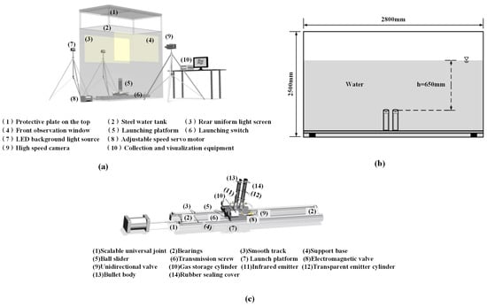 The experimental apparatus [16] comprised a steel open-top tank with dimensions of 2.8 m × 1.6 m × 2.5 m. Two pieces of organic glass with a size of 2.5 m × 1 m were installed on the front and rear walls of the tank. The front glass served as an observation window, while high-power LED (Light-Emitting Diode) light arrays were installed outside the rear glass to enhance background brightness and improve observation quality. Figure 1a shows a schematic of the experimental platform, and Figure 1b presents the launch platform. As shown in Figure 1c, the specific size can be seen in the two-dimensional diagram.