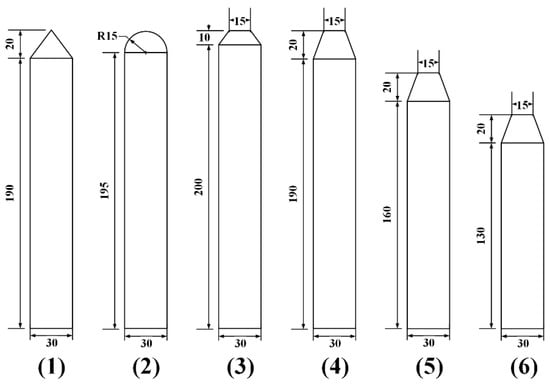 Side view of slender bodies with different head shapes and length-to-diameter ratios (mm): (1)–(6) correspond to No.1–No.6 in Table 1.