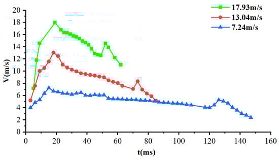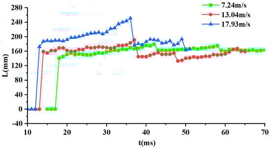 In adjusting the storage tank pressure, the ejection velocity of the slender body can be regulated accordingly. This subsection uses the conical-headed slender body as the research subject, and systematic experiments were conducted at three different pressure values (0.2, 0.4, and 0.7 MPa), with experimental conditions for the three cases shown in Table 3. The cavitation number σ is defined as , where is the far-field pressure (), is the liquid saturated vapor pressure at 20 °C, i.e., , is the liquid density, and is the flow velocity. Lower cavitation numbers indicate more pronounced cavitation phenomena.