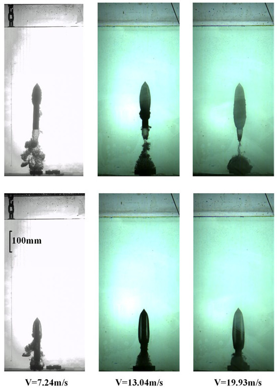 Figure 6 shows the experimental images of conical-headed slender body water-exit at three different ejection velocities. It can be clearly observed that as velocity increases, cavity characteristics change significantly, which is directly related to the reduction in cavitation number.