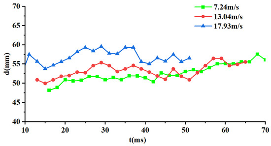 Figure 7 and Figure 8 provide quantitative characterization of cavity length and diameter evolution under the three experimental conditions investigated. The figures indicate that cavity size has a non-linear positive correlation with ejection velocity. At , the maximum cavity length reaches 8.13 D (D is the diameter of the slender body), and the maximum diameter is about 1.99 D, while at , these are only 5.98 D and 2.02 D, respectively.