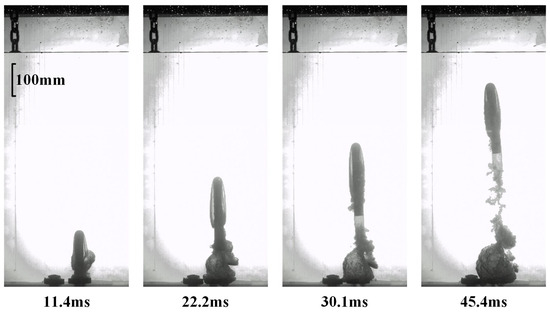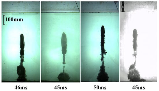 Figure 3 presents sequential high-speed photographic imagery depicting the complete water-exit process of a conical-headed cylindrical specimen at an ejection velocity of . Cavity evolution during slender body water-exit can be categorized into four distinct phases—formation, development, stabilization, and collapse—each corresponding to specific fluid dynamic mechanisms. In reality, the slender body rarely maintains a perfectly vertical trajectory due to the interplay between the rubber sealing cover and high-pressure gas dynamics. For each case, we conducted three sets of experiments, selecting the one with the minimum deflection as the final experimental result. The repeatability of the experiment is confirmed in Figure 4, which shows the error bar chart of the water-exit angle for Cases 1–3, indicating that the deviation in the water-exit angle is within 5%.