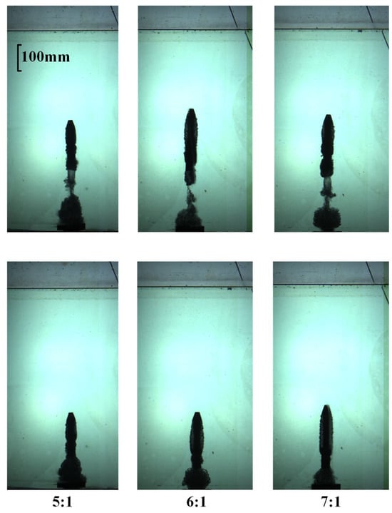 Figure 11 shows the experimental images of long truncated cone slender bodies with three length-to-diameter ratios (7:1, 6:1, 5:1) during water-exit. Cavity formation can be observed in all conditions. Due to differences in slender body geometric dimensions, the cavity coverage areas show clear distinctions. As the length-to-diameter ratio decreases, the proportion of the slender body covered by cavities increases. In comparing the slender bodies with a 5:1 and 7:1 length-to-diameter ratio, the former is almost completely surrounded by cavities, while the latter has only about 60% of its surface area covered by cavities.