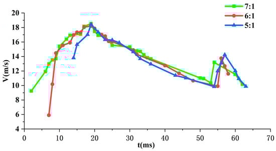Figure 12 shows the velocity evolution curves of three slender bodies with different length-to-diameter ratios (5:1, 6:1, 7:1) during water-exit. The overall trends are basically consistent, with drag coefficients during a deceleration of 0.27, 0.27, and 0.18, respectively, indicating that larger length-to-diameter ratios are beneficial for drag reduction. The drag performance in this paper is consistent with the experimental results in Ref. [27], which revealed that the increase in length-to-diameter ratios and a long truncated cone would cause better drag reduction.