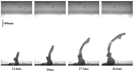 Figure 13 shows the water-exit process of the spherical-headed slender body with the lowest elastic moduli (227.36 MPa). At t = 12.6 ms, the slender body is partially out of the tube, and significant bending can be observed at the head, with a bending angle of approximately 15°. At the moment of tube exit, the static fluid in front of the slender body is compressed. The impact force in the opposite direction of the movement on the moving slender body causes the head bend due to lateral shear force. As the slender body continues to rise (t = 20 ms, 27.2 ms), due to the rightward bending of the head, the subsequent motion trajectory deviates toward the bending direction, and the deformation is further exacerbated. At t = 36.6 ms, the slender body’s bending angle exceeds 90°, the projectile head orientation begins to point downward, and the slender body’s movement direction turns downward, unable to exit from the water successfully.