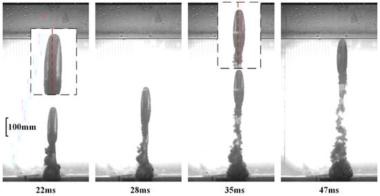 In Case 1 (7.24 m/s), the cavity is relatively small and unstable, mainly distributed near the shoulder of the slender body, showing local cavitation phenomena. At this moment, the cavitation number σ = 3.775, which is much higher than the critical cavitation number (approximately 0.1), indicating that the flow field is dominated by partial cavitation. As the ejection velocity increases to 13.04 m/s (Case 2), the cavitation number drops to 1.164, forming a supercavity covering most of the slender body surface. When the velocity further increases to 17.93 m/s (Case 3), the cavitation number drops to 0.616, producing a larger supercavity completely enveloping the slender body, with both cavity length and diameter significantly increased. Based on Falvey’s research [21], cavitation is virtually inevitable when σ < 0.1. In the experiments, the cavity size is obviously increasing as the cavitation number decreases and supercavitation occurs when σ = 0.616 in Case 3. The cavitation number σ when cavitation occurs is larger than in Falvey’s research, which is due to the remaining air entering the water from the tube.
