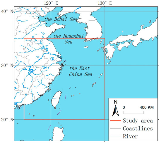 Study area (25° N–35° N, 115° E–130° E, 1.05 × 106 km2).