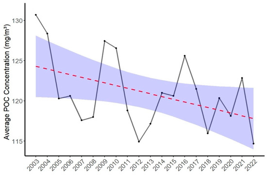 The primary sources of POC in the East China Sea are terrestrial inputs, marine biological production, and the resuspension of seabed sediments [20]. Advances in wastewater treatment, improved agricultural practices, and reduced terrestrial discharges have collectively contributed to a decline in the influx of organic matter and nutrients into the ocean. This reduction has resulted in diminished primary productivity, as evidenced by the downward trend in POC concentrations shown in Figure 3. Furthermore, climate change has substantially influenced ocean temperatures, stratification, and circulation patterns, thereby altering the distribution and availability of nutrients within marine ecosystems [46].
