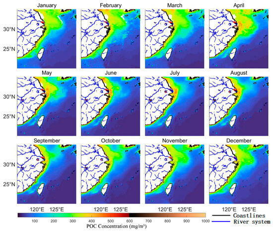 Multi-year average monthly distribution of POC in the East China Sea, 2003–2022.