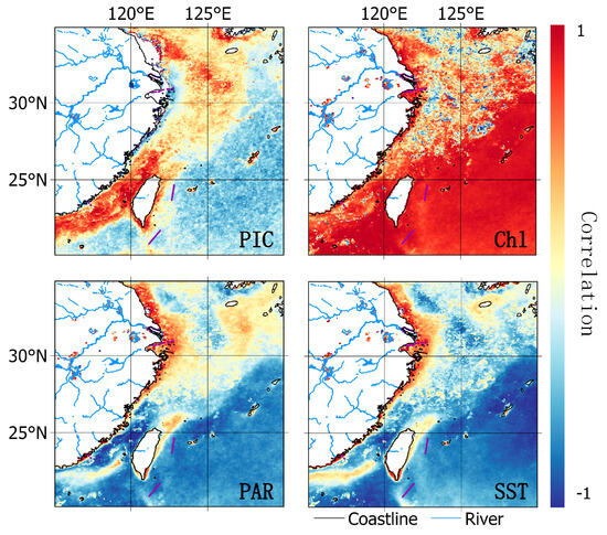 Distribution of POC correlation with Chl, PAR, PIC, SST. This color scale legend represents the correlation coefficients between POC and Chl, PAR, PIC and SST.