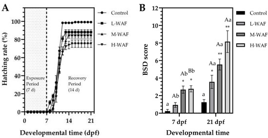 Hatching rates and blue sac disease (BSD) score of marine medaka embryos/larvae exposed to water-accommodated fractions (WAFs) of Oman crude oil (OCO) during the exposure and recovery periods. (A) Time-course dynamics of hatching rates throughout the 21 d developmental time, showing the 7 d acute exposure period (0–7 dpf, shaded area) followed by a 14 d recovery period (8–21 dpf) in clean artificial seawater (n = 50). (B) Comparison of BSD scores at 7 dpf (end of exposure period) and 21 dpf (end of recovery period) across treatment groups (n = 6). Control: artificial seawater; L-WAF: 5% (v/v) WAF; M-WAF: 10% (v/v) WAF; H-WAF: 20% (v/v). Statistical analysis was performed using two-way ANOVA. Asterisks (* and **) indicate significant differences between WAF treatments and control at the same developmental time (p < 0.05 and p < 0.01, respectively). Lowercase (p < 0.05) and uppercase (p < 0.01) letters indicate significant differences between exposure and recovery periods within the same treatment group.