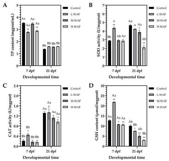 Changes in total protein (TP) content (A), superoxide dismutase (SOD) activity (B), catalase (CAT) activity (C), and reduced glutathione (GSH) content (D) of marine medaka embryos/larvae exposed to water-accommodated fractions (WAF) of Oman crude oil (OCO) at 7 dpf (end of exposure period) and 21 dpf (end of recovery period) across treatment groups (n = 9). Control: artificial seawater; L-WAF: 5% (v/v) WAF; M-WAF: 10% (v/v) WAF; H-WAF: 20% (v/v). Statistical analysis was performed using two-way ANOVA. Asterisks (* and **) indicate significant differences between WAF treatments and control at the same developmental time (p < 0.05 and p < 0.01, respectively). Lowercase (p < 0.05) and uppercase (p < 0.01) letters indicate significant differences between exposure and recovery periods within the same treatment group.