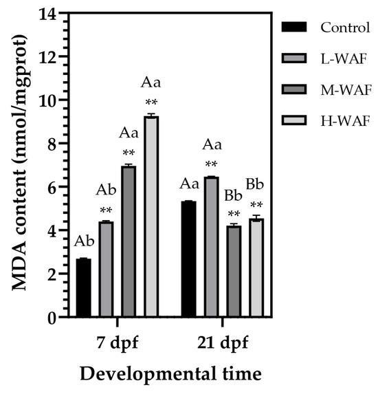 Changes in malondialdehyde (MDA) content of marine medaka embryos/larvae exposed to water-accommodated fractions (WAFs) of Oman crude oil (OCO) at 7 dpf (end of exposure period) and 21 dpf (end of recovery period) across treatment groups (n = 9). Control: artificial seawater; L-WAF: 5% (v/v) WAF; M-WAF: 10% (v/v) WAF; H-WAF: 20% (v/v). Statistical analysis was performed using two-way ANOVA. Asterisks (**) indicate significant differences between WAF treatments and control at the same developmental time (p < 0.01). Lowercase (p < 0.05) and uppercase (p < 0.01) letters indicate significant differences between exposure and recovery periods within the same treatment group.