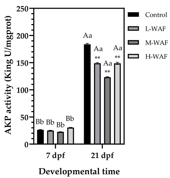 Changes in alkaline phosphatase (AKP) activity of marine medaka embryos/larvae exposed to water-accommodated fractions (WAFs) of Oman crude oil (OCO) at 7 dpf (end of exposure period) and 21 dpf (end of recovery period) across treatment groups (n = 9). Control: artificial seawater; L-WAF: 5% (v/v) WAF; M-WAF: 10% (v/v) WAF; H-WAF: 20% (v/v) WAF. Statistical analysis was performed using two-way ANOVA. Asterisks (**) indicate significant differences between WAF treatments and control at the same developmental time (p < 0.01). Lowercase (p < 0.05) and uppercase (p < 0.01) letters indicate significant differences between exposure and recovery periods within the same treatment group.