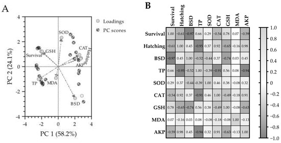 Principal component analysis (PCA) biplot (A) and Pearson correlation coefficient matrix heatmap (B) of the observed biomarkers in marine medaka exposed to water-accommodated fractions (WAFs) of Oman crude oil (OCO) with different nominal concentration during the 7 d acute exposure period and following a 14 d recovery period in clean artificial seawater. The PCA biplot (A) illustrates the separation of the observed biomarker profiles. Loading vectors (light gray dashed lines) indicate the contribution of each biomarker to the principal component (PC) axes. In the Pearson correlation matrix (B), values represent Pearson correlation coefficients (r). Color intensity represents correlation coefficient values ranging from −1.00 (dark gray) to 1.00 (light gray). BSD: blue sac disease score; TP: total protein content; SOD: superoxide dismutase activity; CAT: catalase activity; GSH: reduced glutathione content; MDA: malondialdehyde content; AKP: alkaline phosphatase activity.