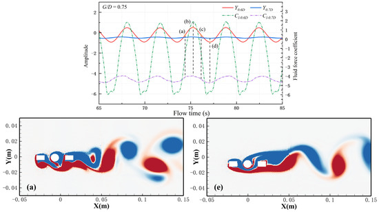 - There is a clear difference in amplitude and lift–drag curves between low gap distances and high gap distances. At low gap distances, the amplitude is low and increases with an increase in the width. In contrast, at high gap distances, the amplitude is high and less influenced by the width. At low gap distances (G/D = 0.25, 0.5), both cross-flow and in-line displacements change smoothly with minimal variation. For high gap distances (G/D > 0.5), selecting an appropriate width can achieve in-line mean displacement (Xmean) of 0. Both the mean drag coefficient (Cd-mean), and the root mean square of the lift coefficient (Cl-RMS) shows a decreasing trend as the width increases. The width has a significant suppression effect on Cd-mean and Cl-RMS.