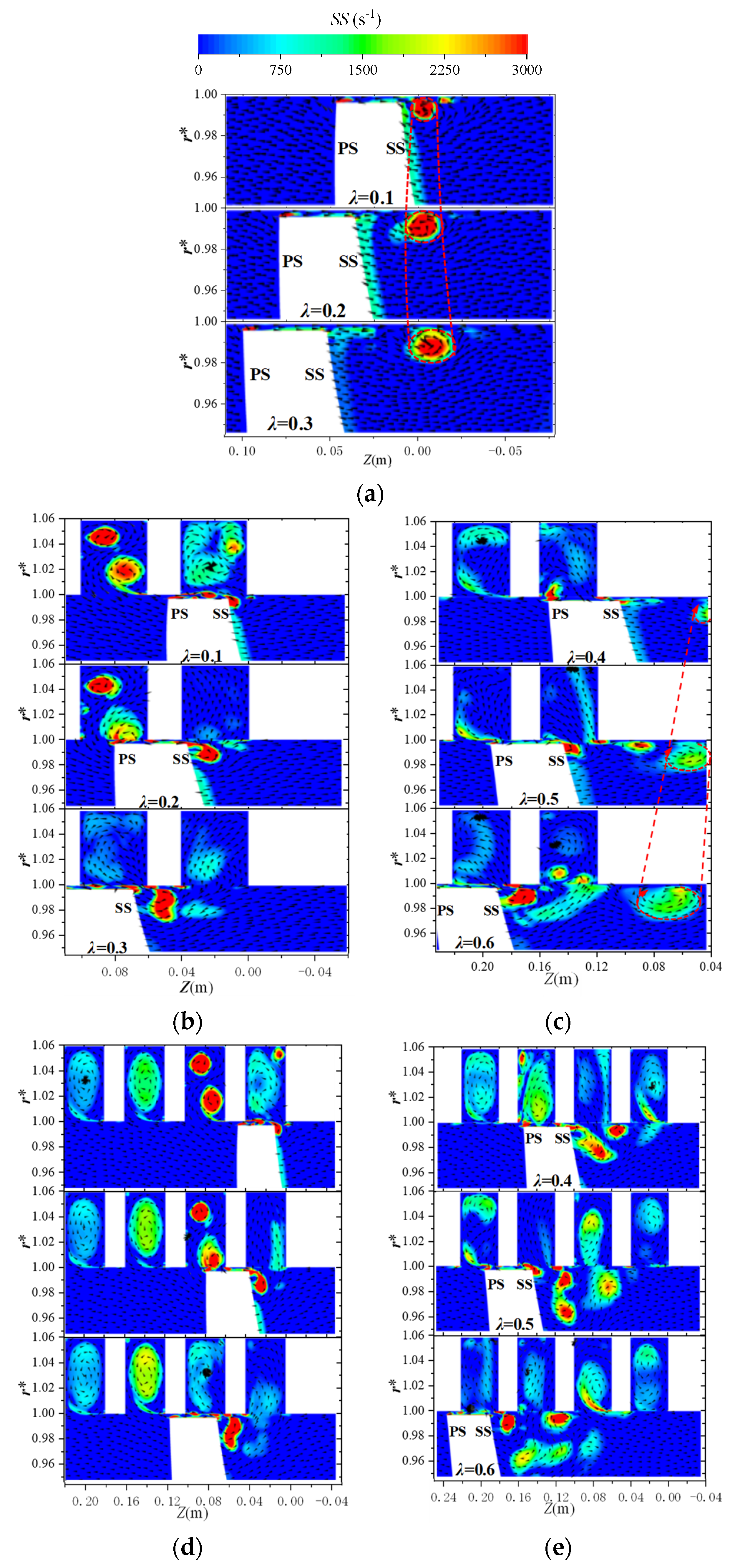 The velocity distribution in the blade tip region can clearly illustrate the entry of the tip leakage flow into the suction side and its interaction with the main stream. Figure 15 presents the axial velocity distribution in the blade tip region for the prototype pump and various grooving cases across different sections. As depicted in Figure 15a, the axial velocity profiles of the original pump across sections S1 to S3 reveal a clear trend. A negative Vz value signifies that the tip leakage flow jets out from the pressure side and makes its way into the suction side. It is in the highlighted area that this leakage slams into the primary flow, giving rise to a TLV structure. Then, it gradually moves away from the blade in the passage, thereby increasing its influence range. The axial influence ranges in the S1 to S3 sections are ΔZ = 0.065, 0.090, and 0.115, respectively. In Case A, the influence of the circumferential grooves on the tip flow field is primarily near the leading edge of the blade. Thus, sections S1 to S3 are selected for analysis as shown in Figure 14b. Compared to the prototype pump, G1 and G2 suppress the entry of tip leakage flow into the suction side near the leading edge of the blade. In the S1 section, the leakage flow is essentially trapped within the blade tip gap by G1, which nips any chance of a TLV forming on the suction side right in the bud. Moving on to the S2 section, you can see the tip leakage flow actually taking shape at Z = 0.06 m due to the influence of G2. After entering the suction side, it is affected by G1, leading to a significant reduction in both its intensity and influence range compared to the prototype pump. In the S3 section, the tip leakage flow is primarily influenced by G2, with a range similar to that in the S2 section. In Case B, the influence of the circumferential grooves on the tip flow field is mainly in the middle to rear part of the blade tip. Therefore, sections S4 to S6 are selected for analysis. In the S4 section, G3 first interferes with the tip leakage flow, resulting in the emergence of a flow with a negative axial velocity at Z = 0.12 m within the blade tip gap. It continues to develop and interact with the main stream after entering the suction side near the rotor chamber wall. In the S5 section, due to the influence of G3 and G4, there is no longer a significant flow with negative axial velocity within the gap. However, a small area of negative values still exists near the suction side rotor chamber wall. At the blade’s edge, circumferential grooves expand the radial reach of tip leakage. This phenomenon is more pronounced in the S6 section, where the radial interference range of the tip leakage flow expands to r* = 0.97. Case C includes G1, G2, G3, and G4, facilitating a comparative analysis of sections S1 to S6. The blade tip gap in these six sections is affected by the circumferential grooves. In sections S1 and S2, the tip leakage flow is suppressed by the circumferential grooves, resulting in negligible impact on the SS side. At λ = 0.3, a small area of negative values appears near the suction side of the blade tip, primarily between G1 and G2. As the chord length coefficient increases, a TLV vortex region gradually emerges on the SS side. At this point, the TLV vortex structure primarily influences the flow field radially near the blade wall.