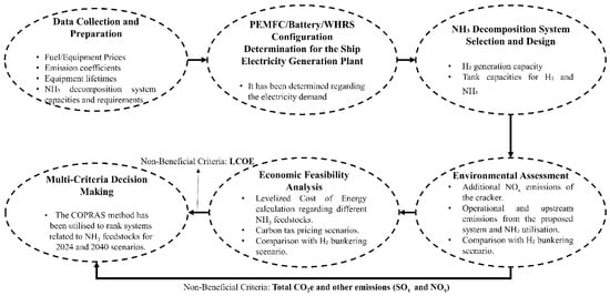In the initial stage of the analysis, data on prices, emission coefficients, and properties of the NH₃ cracker were collected. The two PEMFC/battery/WHRS configurations for the marine electricity generation unit were proposed. Subsequently, the design of the NH₃ decomposition system, including the tank and production capacity for H₂, was determined.