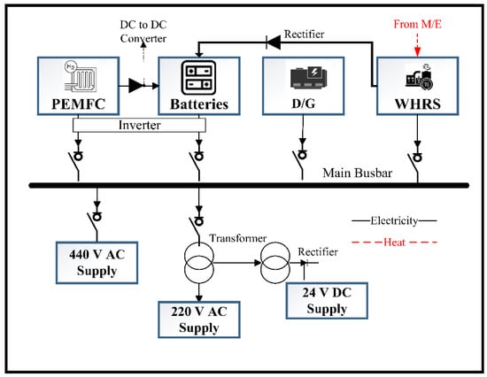 The batteries are charged by the WHRS utilising the exhaust waste heat from the M/E, in conjunction with PEMFCs, as illustrated in Figure 2. The direct current (DC) of PEMFCs and batteries is inverted to alternating current (AC) before being given to the grid. The ship electrification components’ specifications and model details were provided in Yuksel and Koseoglu [37].