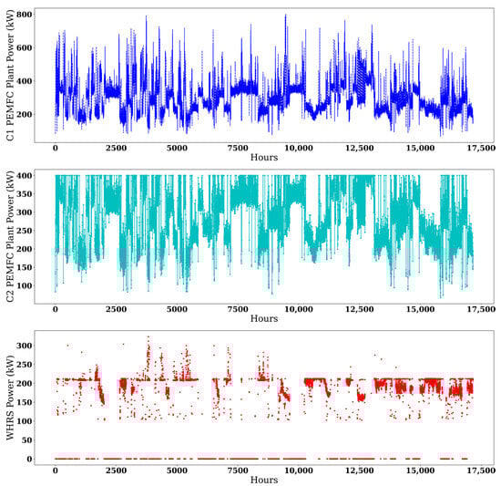 This analysis examines two distinct hybrid designs. C1 features a larger FC system with an enhanced battery capacity that can support the load of two generators. This setup comprises four FC units, each rated at 800 kW, supplemented by a WHRS providing average 197.01 kW and a battery storage capacity of 443 kWh. Together, this configuration effectively meets the combined load of the two generators, totalling 1440 kW.
