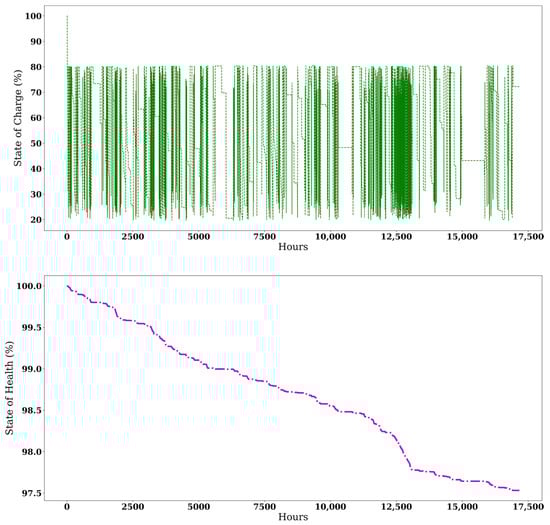 The reduction in the battery’s capacity was computed throughout its operation, incorporating adjustments influenced by the C-rate. The SoH was determined using Equation (4), which defines SoH as the ratio of the actual battery capacity () after degradation to the initial capacity () at the start of operation.