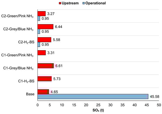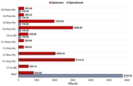The Haber–Bosch process is one of the methods to produce NH3 by combining nitrogen and H2 through a thermocatalytic reaction [43]. When the manufacturing was performed using natural gas via steam-methane reforming (SMR), the NH3 was labelled as “Grey”, and the process was assumed to emit 1.88 t-CO2e/t-NH3 in this study. “Blue NH3” manufacturing includes a carbon capture system in the plant and reduces emissions to 1.23 t-CO2e/t-NH3 [44,45]. If the NH3 has been produced utilising renewable/clean energy, it is named green NH3, emitting 0.177 t-CO2e/t-NH3. Nuclear-sourced NH3 is named pink in this study, having an emission level at 0.17 t-CO2e/t-NH3 [44,46].