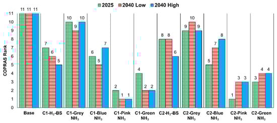 The environmental performance of the cracker-involved operations was assessed, considering nitrous oxide (NOx) emissions from NH₃ combustion and the sulphur oxides (SOx) and CO2e resulting from the NH3 production methodology. System economic viability was evaluated by calculating the LCOE for 2025 and 2040 using different colour-coded NH3 as the feedstock. This financial performance was compared with the green H₂ bunkering scenarios (H2-BS). The outcomes of these analyses were combined in an MCDM analysis, and the configurations were ranked regarding the NH3 colour codes.