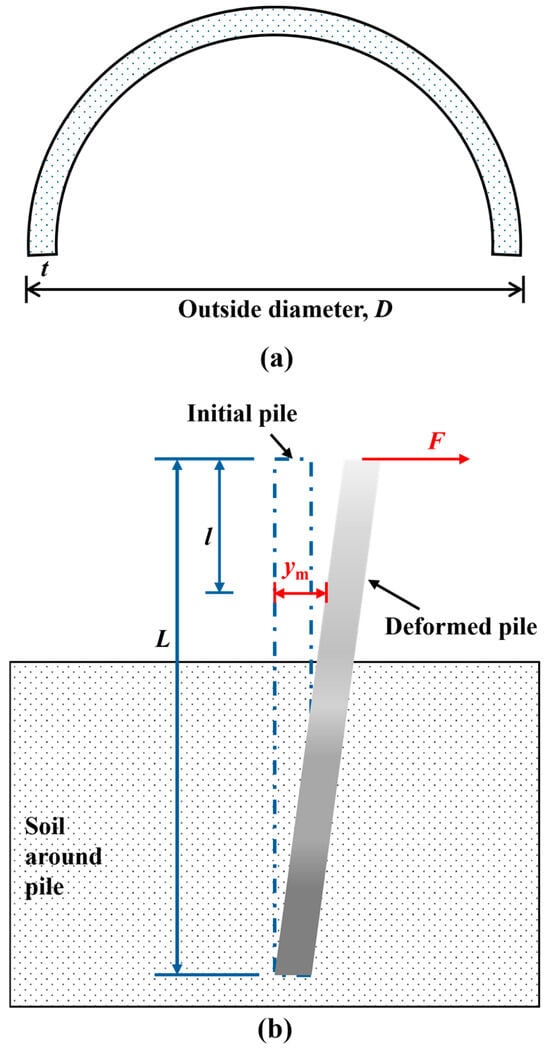 Currently, common methods for analyzing pile–soil interaction primarily include theoretical approaches [,], empirical methods [,], and numerical techniques [,,]. Theoretical methods typically simplify piles as idealized models such as cantilever beams [,,]; however, due to excessive simplification, these approaches fail to adequately account for complex factors in pile–soil interaction, including soil nonlinear mechanical properties and variations in pile–soil interface friction []. Empirical methods are analytical approaches developed from extensive engineering practice or experimental data, with the p-y curve method being a typical representative model. Due to its simple expression and convenient application, this method has been widely adopted in various international specifications [,,]. The method constructs empirical expressions between pile displacement and soil reaction force by fitting experimental data [,].