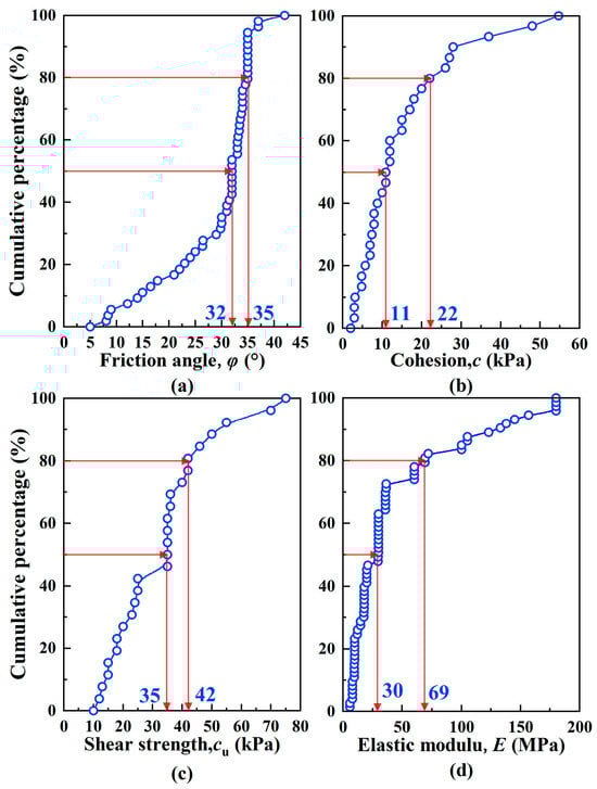 Cumulative percentage of soil strength parameters from field tests in the database (a). Friction angle, φ (°), (b) cohesion, c (kPa), (c) shear strength, cu (kPa), (d) elastic modulus, E (MPa).