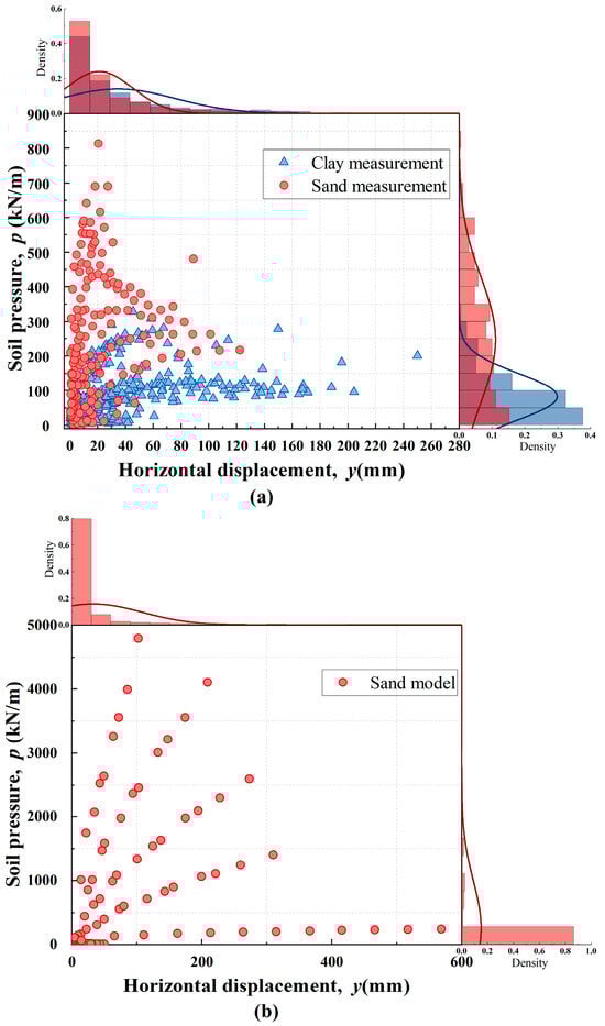 Nonlinear correlation between horizontal displacement and soil pressure. (a) Field measurement results for clay and sand, (b) model test results for sand.