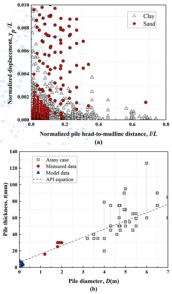The design parameters of the piles in the database. (a) Normalized displacement versus normalized pile head-to-mudline distance for clay and sand, (b) pile thickness versus pile diameter.