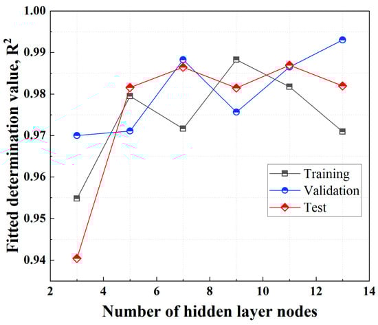 Equation (3) establishes the theoretical upper bound for nodes in the hidden layer. To systematically evaluate optimal network architecture, we conducted a parametric study by training networks with incrementally increasing hidden layer complexity (3, 5, 7, 9, 11, and 13 nodes) and assessed their performance against established metrics. Figure 6 plots the coefficient of determination (R2) across training, validation, and test datasets. Increasing node count initially enhances model performance, as evidenced by rising R2 values. However, beyond 5 nodes, R2 exhibits pronounced fluctuations across all datasets. Networks with more than 9 nodes show a declining R2 trend in training and test datasets, indicative of overfitting. This suggests that in geotechnical modeling, a moderate number of nodes (5–7 nodes) optimizes generalization capability, while excessive complexity degrades validation/test accuracy.
