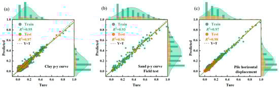 As illustrated in Figure 8, the neural network demonstrates outstanding predictive performance. For the clay p-y curve model, both the training and testing phases exhibited strong convergence (R2 ≥ 0.95). The neural network model for sand p-y curves demonstrated robust correlation with experimental data, achieving a test set R2 = 0.96. This statistical validated confirms the model’s high predictive accuracy and reliability for both sandy soils and clayey soils.