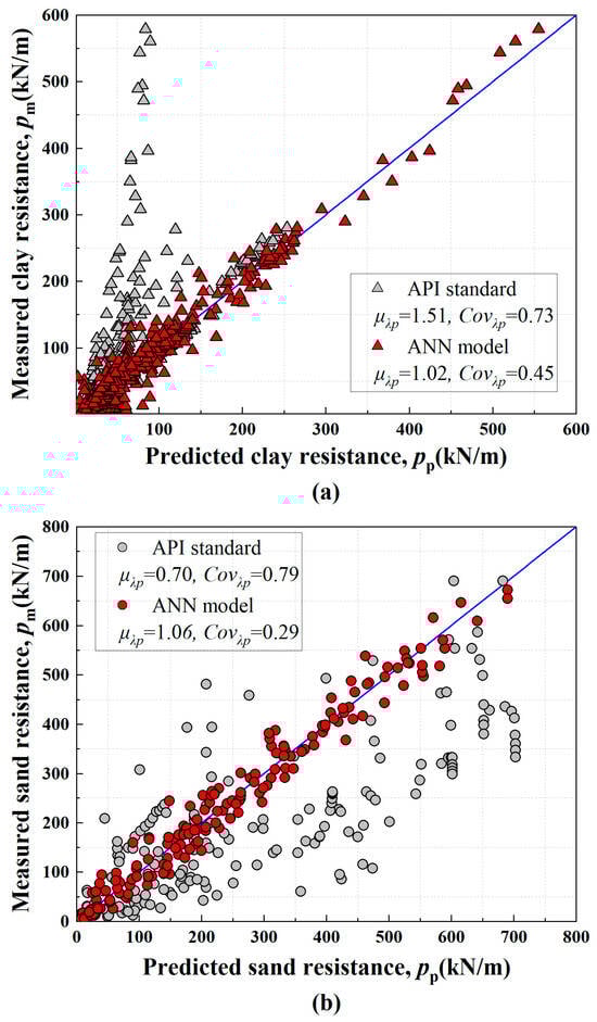 Comparison of predicted and measured soil resistance for clay and sand using the ANN model and API standard. (a) Clay resistance, (b) sand resistance.