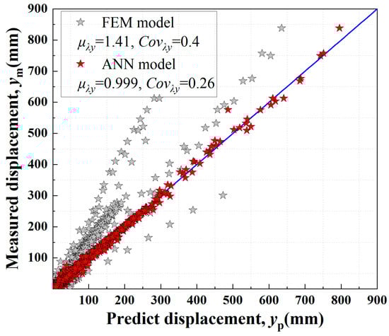 The measured data from field tests on the horizontal bearing capacity of offshore wind turbine pile foundations were input into the trained neural network model to obtain predicted values of horizontal displacement. These predicted values were then compared with the actual measured horizontal displacements, as illustrated in Figure 10. Observing the distribution of the data points, it is evident that the predictions from the neural network model are predominantly concentrated near the line along the 1:1 reference line, indicating low data dispersion. Specifically, the mean value of the model factor is μλ = 0.9, with a coefficient of variation COVλ = 0.26.