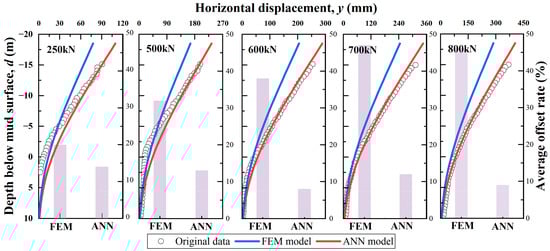 Comparison of horizontal displacement predictions from ANN model and FEM model with measured data.