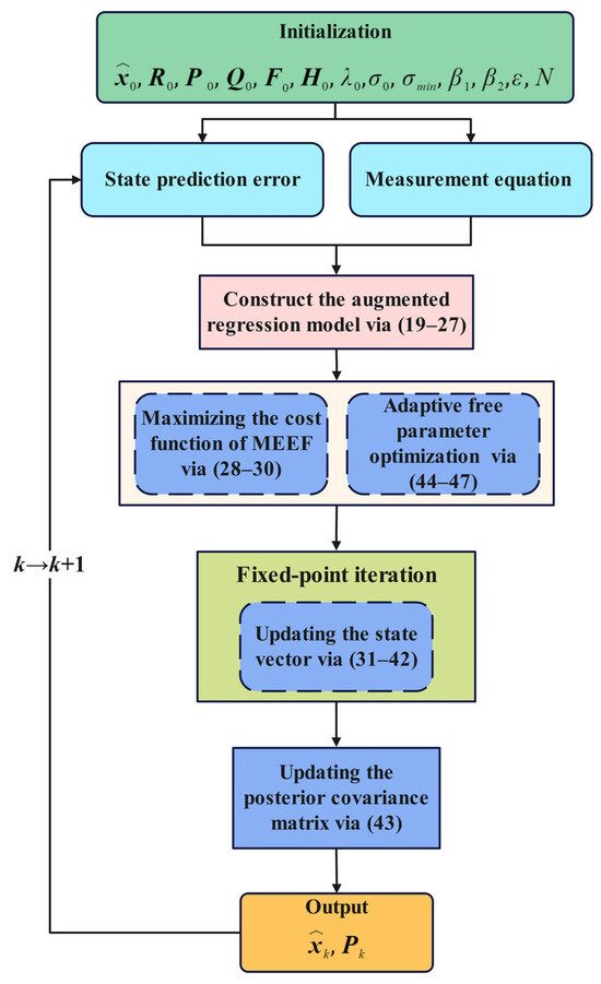 | Step 1: Initialize the state a priori estimate and the corresponding state prediction error covariance matrix ; choose a specified small positive value ; set a nominal weight factor ; Step 2: Utilize Equations (14) and (15) to get and , use Cholesky decomposition to get and ; calculate the and ; Step 3: Construct the error discrimination statistic by Equation (44), calculate the variable kernel bandwidth by Equations (45) and (46), and determine the weight factor by Equation (47); Step 4: Let and , where represents the estimated state at the fixed-point iteration : |